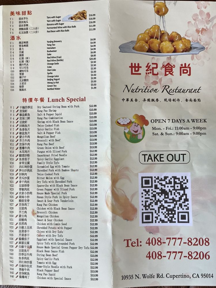 Nutrition Restaurant in Cupertino offers a Chinese menu with a range of options, including vegan and vegetarian dishes. Customers praise the sesame cake with beef/egg, you tiao, soy milk, Chinese donuts, and sticky rice burritos for their freshness and flavor. The restaurant provides a unique ordering experience through iPads and QR codes, offering convenience and tech-savvy service. Dishes like pork and taro pot, sautéed garlic pea sprouts, and soured/pickled napa cabbage with lamb stand out for their hearty and flavorful taste. The friendly staff accommodates large groups and special occasions, making it a great spot for family gatherings or celebrations. With comfortable seating, a casual atmosphere, and a wide variety of options, Nutrition Restaurant is a top choice for delicious Chinese food in the Cupertino area.